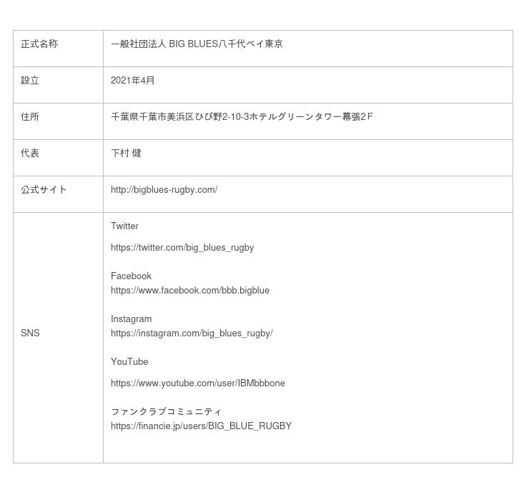 一般社団法人BIG BLUES八千代ベイ東京は2021年に設立され、千葉県八千代市を拠点に活動しているラグビーチームです。
