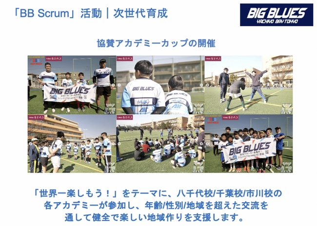 「次世代育成」「安心安全な地域社会の実現」「テクノロジーの活用(ラグビー界での事例づくり)」を基軸に、ラグビースキル専門教室「BBB RUGBY ACADEMY」の運営や、地域の子ども達にむけたラグビー教室の開催、朝食支援活動、八千代市社会福祉協議会との災害時のパートナーシップ締結、日本ラグビー界初のトークン発行など、地域で活動する皆様に試合に「勝ち」と社会貢献活動を通してチームの「価値」を高め、地域社会の皆様にラグビーを通した恩返しを進めて参ります。