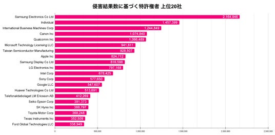 第2位には個人発明家がランクインしました。個人発明家とは世界中の個人発明家が保有する特許を全て足し合わせた上で、米国における被侵害を分析した結果です。Samsung はこの個人発明家よりも 700,000 件以上多くの被侵害可能性を有しており、収益性のある特許のマーケットリーダーであることが示唆されます。