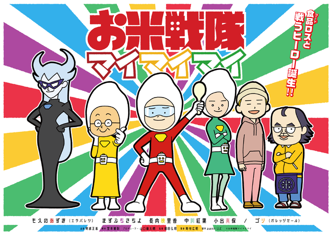 本作話題の声優陣は、大食い女王・アイドルなど幅広く活躍中のもえのあずき(エラバレシ) ・大人気の大食いYouTuber、ますぶちさちよ。戦隊メンバーのイエロー・マイコ役を、映画『台風家族』や『罪の声』に出演した女優の長内映里香、戦隊グリーン・マイナ役を、『Ray』専属読者モデルで女優の中川紅葉がそれぞれ担当します。そして、戦隊を支える米問屋の大蔵役として、人気お笑い芸人ガレッジセールのゴリが特別出演! ほかにも、TV『とんねるずのみなさんのおかげでした』(フジテレビ)で注目を浴びたモノマネ芸人の小出真保など、バラエティーに富んだ個性豊かなキャスト陣が物語をゆる~く盛り上げます。