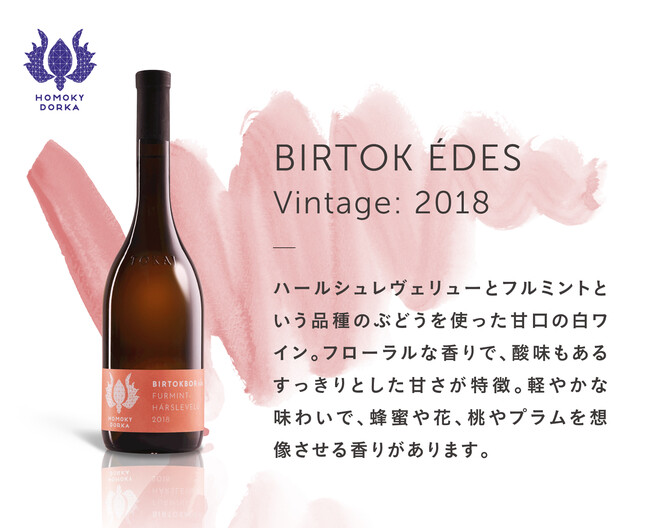 スイートワインはハーシュレヴェルーとフルミントというハンガリーを代表する品種を使い、カジュアルにお楽しみいただけるワインです。寿司やカルパッチョなど魚介系 料理、さっぱりとしたドライチーズなどとのマリアージュが楽しめます。