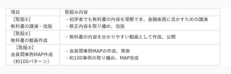 2022年度に金融AIの教科書出版により、金融AIのコア領域となる「7つの成功パターン」を定義完了したことを受け、2023年度は教科書の講演・改版【1.】、業界全体へ浸透するための講義・動画化【2.】、会員間事例MAP作成【3.】の3つに取り組んでまいります。