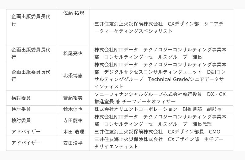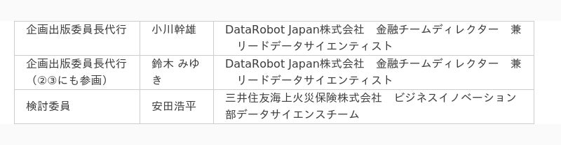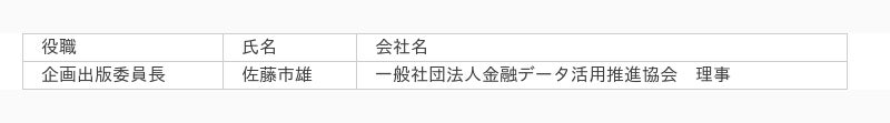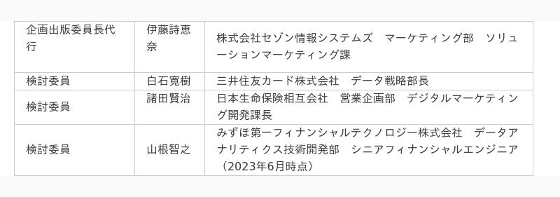 今後、この実践ノウハウを広く金融機関と共有することで、金融業界のAI・データ活用を更に推進し、個人が活躍できる環境を整備するために「企画出版委員会」の委員の体制を強化することに致しました。