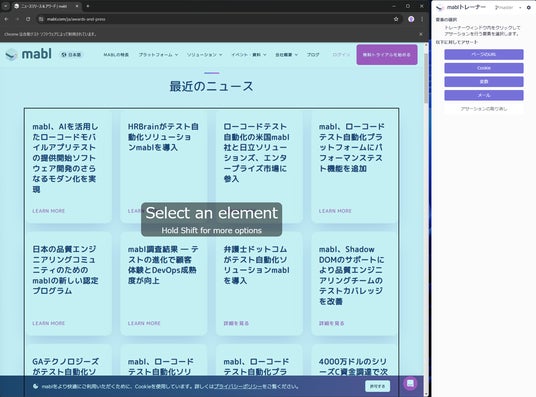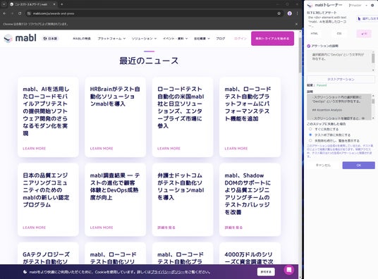 mablのニュースリリース内でAIアサーションを実行。複数あるニュースの一覧から”DevOps”という文字列が存在することをアサートした(キャプチャ2枚目は選択範囲)