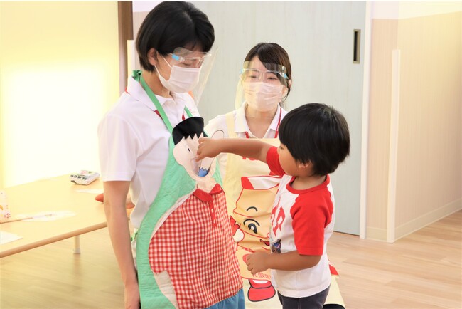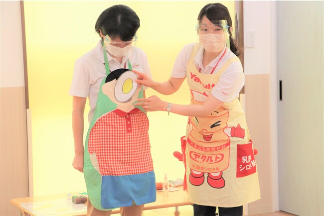 ヤクルトキッズスクールでの「おなか元気教室」は年3回程、定期的に開催しています。7・8月に行われたおなか元気教室の内容は、エプロンシアター・リズム体操・制作遊びです。 エプロンシアターでは、食育のエプロンを使って、食べた食べ物がおなかの中でどうなっていくか、食べた後にウンチが出てくることなどお伝えしています。