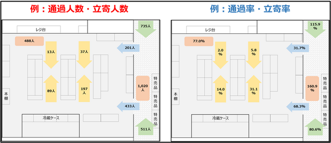 ・カメラ設置場所をプロットした店内マップに通過人数・立ち寄り人数、通過率・立ち寄り率を記載します。