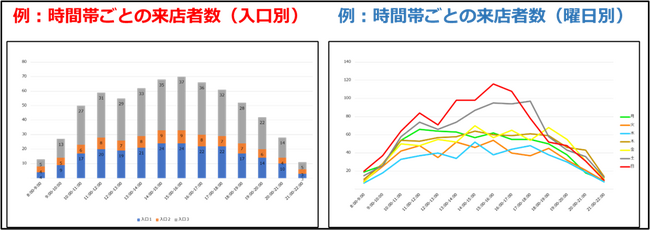 ・1時間ごと、曜日ごと、入口ごとの人数や属性(性別・年齢)のグラフを計10種類出力します。