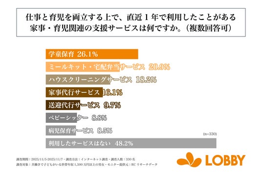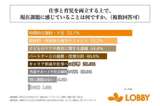 株式会社ロビー(本社:東京都新宿区、代表取締役:対馬 誉仁)が運営する家事代行サービス「LOBBY」は、共働きで子どもがいる世帯年収1,500万円以上の男女を対象に「世帯年収1,500万円以上の共働き子育て世帯の仕事と育児両立に関する調査」を実施しました。この調査から、共働きで子どもがいる世帯年収1,500万円以上の男女が仕事と育児を両立する上での課題や、家事・育児関連支援サービスの利用実態などが明らかになりました。