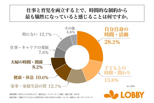 次に、「仕事と育児を両立する上で、時間的な制約から最も犠牲になっていると感じること」を尋ねる設問への回答では、1位が「自分自身の時間・活動」で28.2%、2位が「子どもとの時間・関わり」で15.8%、3位が同率で「特にない」と「家事・家庭生活の質」で12.7%という結果になりました。この結果から、仕事と育児を両立する上で、時間的な制約から最も犠牲になっていると感じることは「自分自身の時間・活動」であることがわかりました。