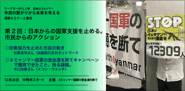 2回目は、12月20日の19:30よりオンラインセミナー「日本からの国軍支援を止める。市民からのアクション」を開きます。ミ日本政府や企業は、様々な形でミャンマー国軍を支えてきています。その現状と、日本からの支援を止めるために市民が取り組んできたことについて報告します。