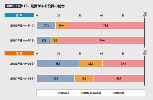 IT分野において見識がある役員が3割以上占める比率を日米で比較すると、2022年度の調査結果によれば、日本は27.8%であり、一方で米国は60.9%であることが示されています(図表1-14)。
