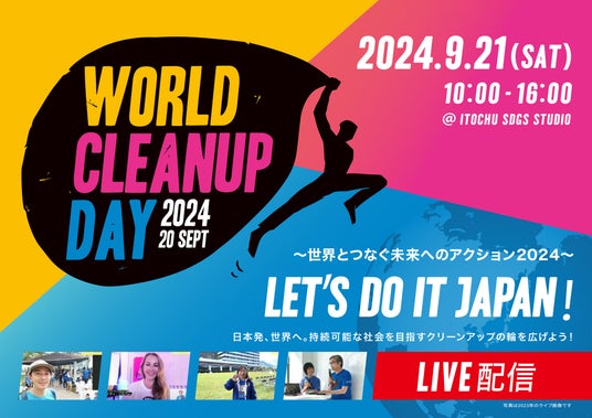 NPO法人WORLD CLEANUP DAY JAPAN は 2024年9月21日(土)、ITOCHU SDGs STUDIO(東京都港区北青山2-3-1 Itochu Garden B1F)にて、日本やアジア各地のクリーンアップ会場をつなぎ、日本や世界のごみ問題への取り組みを紹介するライブ配信イベント「LET’S DO IT JAPAN! ~世界とつなぐ未来へのアクション2024~」を実施します。
