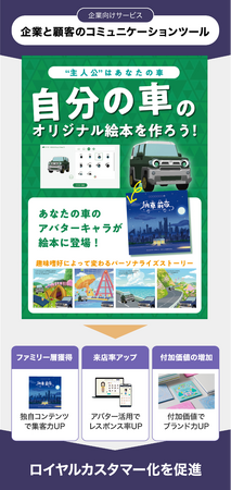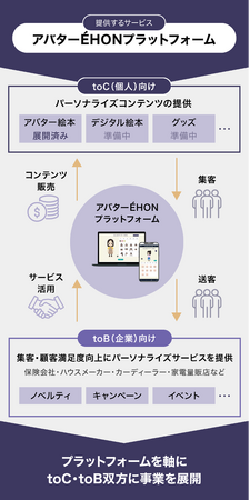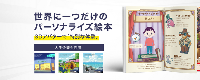 えほんインク株式会社は「アバターEHONプラットフォーム」を提供しています。アバターを生成することで、それが様々な形で自分ごと化されたコンテンツやサービスとなり、これまで以上に顧客満足度を高められるサービスを一般の消費者および企業に提供したいと考えています。