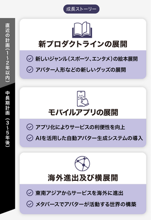 えほんインクの強みは、急成長市場でベンチマーク企業との差別化を実現できることです。その一方で、弊社の「アバターEHONプラットフォーム」は、名入れに留まらずアバターを活用するという特徴があり、成功事例として海外他社を参考にしつつ、他のサービスと差別化を図りながら成長を目指します。