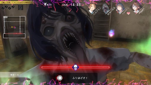 対戦プレイでは最大4名の同時プレイが可能で、誰か一人がランダムで魔物になってゲームを行います。人間側は協力して魔物を回避しながら封印を解いて脱出すると勝利。魔物側は、人間全員を魔物化して、廃校からの脱出を阻止するゲーム性が楽しめます。