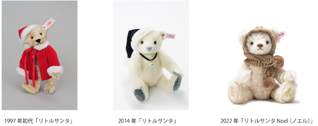 「リトルサンタ」とは、1997年から毎年、日本限定クリスマスモデルとして発表されているテディベアです。毎年、モチーフを変えて発売し、デザインの可愛らしさが大変好評いただいております。1997年発売の初代リトルサンタは、クラシカルで正統派なデザインに、真っ赤なベルベットのジャケットと帽子を着用したテディベアとして販売いたしました。