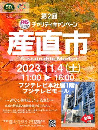 今年は「ドリーム夜さ来い祭り」(11月4日・5日)と連動して、11月4日(土)に「第2回FNSチャリティ産直市」を開催します。今回で22回目を数える「ドリーム夜さ来い祭り」は全国より75チーム5,000人が参加する、東京でも最大規模のきらびやかなお祭りです。 昨年に続き、2回目の開催となる「FNSチャリティ産直市」は「ドリーム夜さ来い祭り」開催初日にフジテレビ社屋1F「フジテレビモール」で実施し、互いに連動しながら、連休で賑わうお台場をさらに盛り上げます。