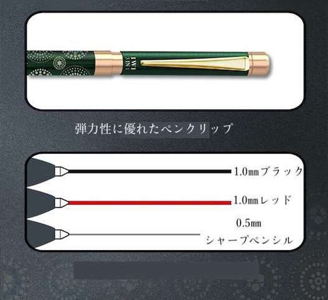 シンプルな外観、クラシックで高級感のあるカラーリング、黒のボールペン、赤のボールペン、0.5ミリシャープペンシル と消しゴムが付いた、実用性も高い多機能ペンです。