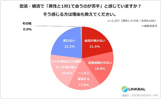 2023年10月にリンクバルで『恋活・婚活に関する実態調査(n=2,297)』を実施し、「会話が続かない」「恋愛経験が少ない」などを理由に、「異性と1対1で会うのが苦手」が76.9%を占めていることが分かりました。