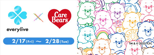 エブリライブ株式会社(本社:東京都新宿区・代表取締役:佐々木尚之)が運営するライブ配信アプリ「everylive(エブリライブ)」は、2023年2月17日(金)よりアメリカ生まれのキャラクター『Care Bears(TM)(ケアベア(TM))』とのコラボイベントを実施いたします。