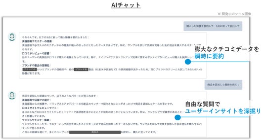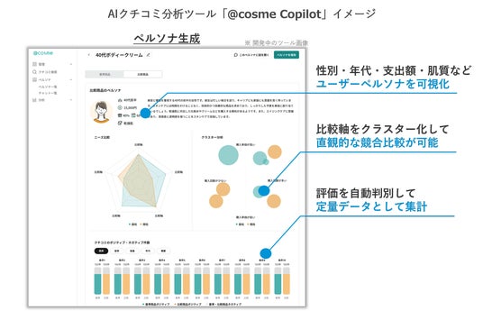 生成AIを活用して@cosmeに投稿されたクチコミを分析し、自ブランドの現状分析やマーケティング施策の振り返り、商品開発などに活用できるサービス