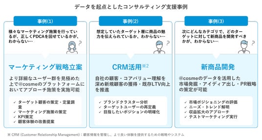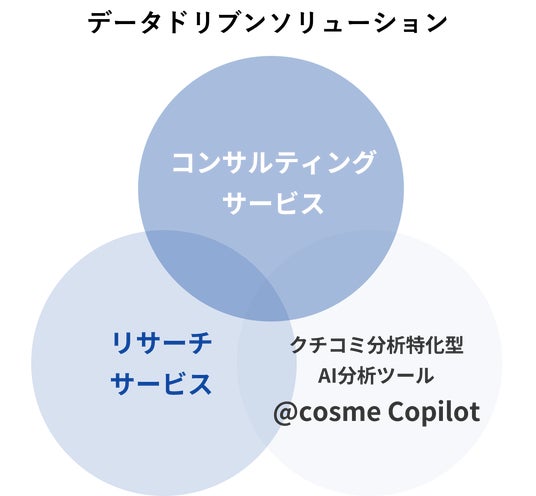 今回ローンチしたデータドリブンソリューションは、@cosmeが、コスメ・美容の総合サイト「@cosme」、EC「@cosme SHOPPING」、実店舗「@cosme STORE」を運営する中で蓄積してきた、カスタマージャーニーを一気通貫した膨大なデータを統合した統合データ基盤(以下、CDP)を活用して、以下の3つのサービスを提供するものです。本事業を通じて、ビューティー業界のデータドリブンな意思決定を促進してまいります。