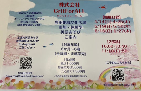 生まれた家の家庭環境に関わらず、園に通う全ての子ども達が平等に質の高い英語に触れる機会を提供するための仕組み作りがしたいと思い、2022年10月4日に愛知県豊田市内にて会社株式会社GritForALL(グリットフォーオール)を設立しました。