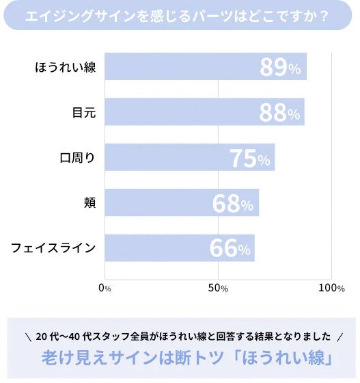 「エイジングサインを感じるパーツはどこですか?」(複数回答)と聞いたところ、1位「ほうれい線」(89%)、2位「目元」(88%)、3位「口周り」(75%)、4位「頬」(68%)となり、20~40代まで総じて「ほうれい線」が気になるという結果が出ました。