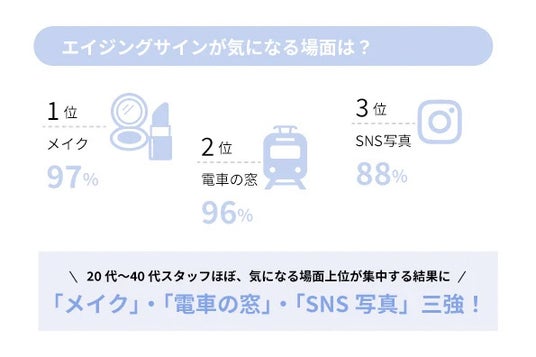 「エイジングサインを感じる場面は?」(複数回答)と聞いたところ、1位「メイク」(97%)、2位「電車の窓」(96%)、3位「SNS写真」(88%)となりました。
