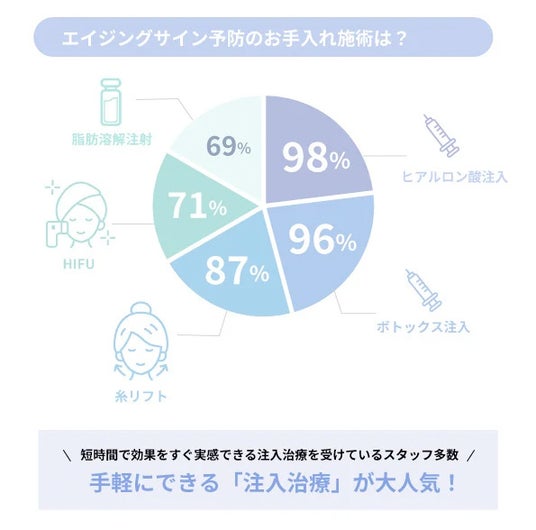 「エイジングサイン予防のお手入れ施術は?」(複数回答)と聞いたところ、1位「ヒアルロン酸注入」(98%)、2位「ボトックス注入」(96%)、3位「糸リフト」(87%)、4位「HIFU」(71%)、5位「脂肪溶解注射」(69%)となりました。