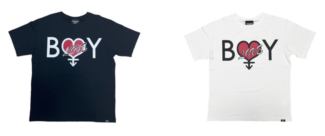 今回のデザインはNAO氏が35年前のBY-SEXUAL結成当初、日本人にはまだ「バイセクシュアル」と言う言葉自体が浸透して無いと言う事で作り出し、未だに使っているアイコンをモチーフに製作。1994年のBY-SEXUALによる全国ツアー「LOVE TOUR」時に一部の関係者様だけにNAO氏が個人的に作った非売品Tシャツを完全再現しました。本人が好きで10代の頃から愛用している「BOY LONDON」とのコラボと言う事で、ジェンダーレスを問われる世間に向け新しい形の「LOVE&PEACE」のアイコン提案として製作致しました。また、店舗では元BY-SEXUALのDr.のNAO氏を中心に結成された「FOOD」のストアミュージックコラボレーションを展開、FOODの楽曲が流れる空間を心ゆくまでお楽しみください。