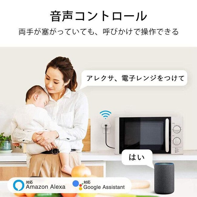 AlexaまたはGoogle Asistantに音声で指示を出せば、スマートプラグで家庭用電気製品を制御できます。両手がふさがっていても、声だけでコントロール可能となります。