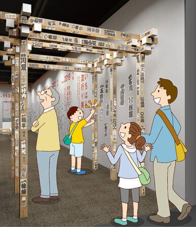 展示室の入口の寺社フレームに千社札を貼って、博物館に来た証を残そう!