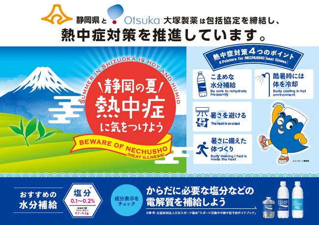 ウエルシア薬局の店舗内は、常時空調により涼しい環境が整備されており、「夏のお休み処」には、大塚製薬が提供する熱中症対策のポスターやリーフレットによる啓発の資料を掲示、島田市は市民に対して「夏のお休み処」の利用を呼びかけるとともに、こまめな水分補給の重要性も同時に啓発致します。
