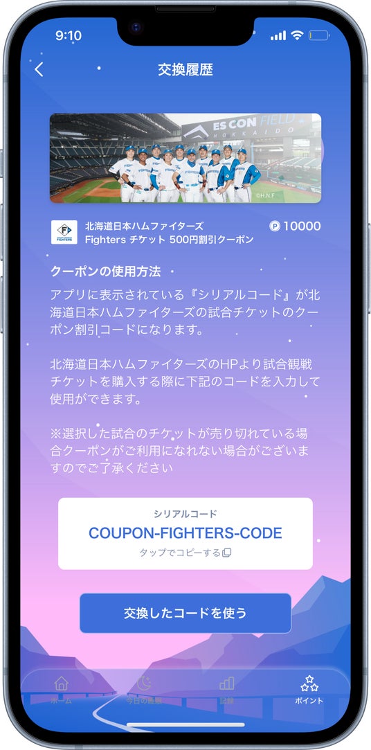 「NeruBank」ユーザーがアプリ内で貯めたポイントを北海道日本ハムファイターズのチケット割引クーポンに期間限定で交換ができます。