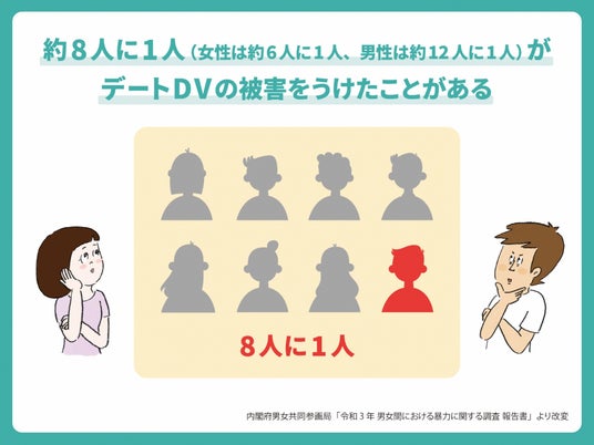 全国20歳以上の人を対象とする内閣府の調査(令和3年)によると、交際経験があった人のうち、女性は6人に1人、男性は12人に1人がデートDVの被害を受けたことがあるとされています。