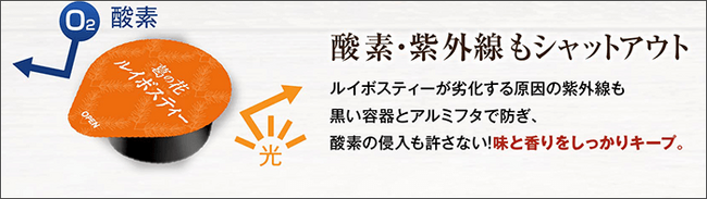 ルイボスティーが劣化する原因の紫外線や酸素の侵入を黒い容器とアルミフタで防ぎます。