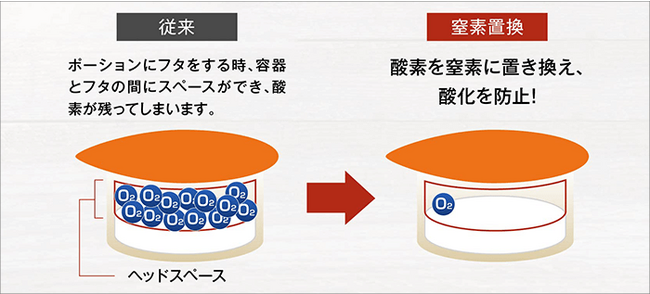 さらにポーションにフタをする時、容器とフタの間のスペース(ヘッドスペース)にある酸素を窒素に置き換え、容器内の酸素を減らし、酸化を抑制することで、味と香りをしっかり守ります。