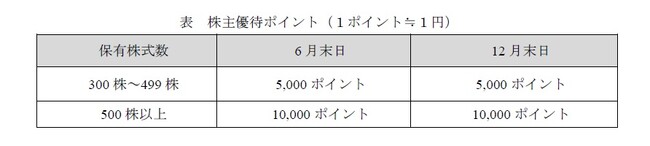 繰越条件:ポイントは6月末日、12月末日において株主名簿に同一株主番号で連続2回以上記載され、かつ300株以上継続保有されている場合にのみ繰越することができ、最大4回分まとめて交換することができます。