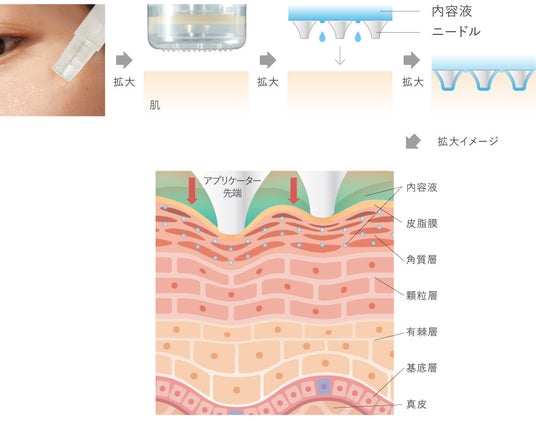 本製品のアプリケーター(先端部)は、針を突き刺す方法とは異なり、肌に物理的なダメージを与えることなく、成分を角質層まで届けて浸透をサポートします。