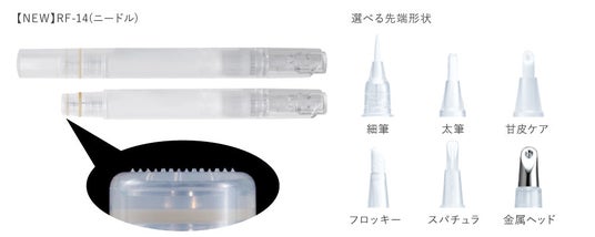 RF-14は、さまざまな用途に対応できる先端をもつ、バリエーション豊富なペン型容器です。アイライナーやグロス、甘皮ケア、目元のケアにおすすめです。その他の先端パーツの種類や製品スペックについてはこちらをご覧ください。