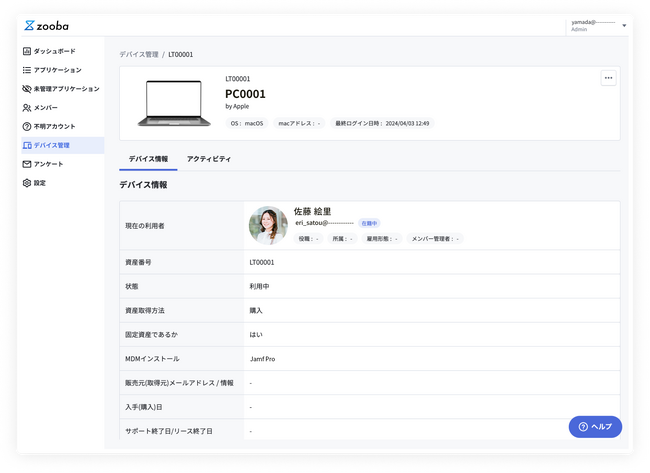 「Jamf Pro」とzoobaが連携しデバイス情報を一元管理することで、ユーザーの最終ログイン時刻、ホスト名の情報などデバイスのリアルな情報を確認することができ、その状態に合わせ、「zooba」から棚卸し(特許出願)、アナウンスを実現することができるようになりました。