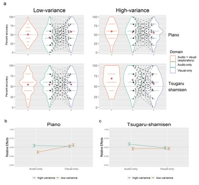 図1. aは1位の演奏者を正しく選んだ割合を示すバイオリンプロット(n=155)。赤い菱形は平均値。bとcはクラシックピアノと津軽三味線の相対効果の交互作用を示している。棒線はANOVA型統計に基づく95%信頼区間。破線(q=0.5)は効果がない。
