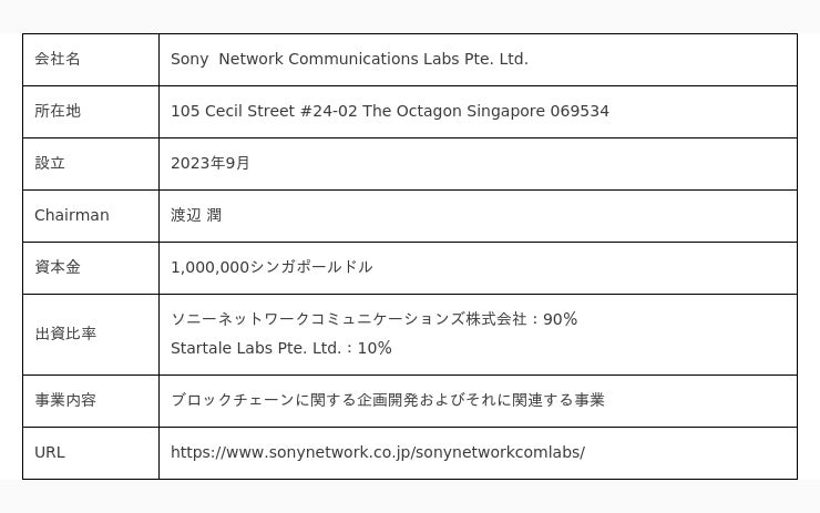 ソニーネットワークコミュニケーションズ株式会社(本社:東京都港区、代表取締役 執行役員社長:渡辺 潤 以下ソニーネットワークコミュニケーションズ)とStartale Labs Pte. Ltd. (本社:シンガポール 代表取締役CEO:渡辺 創太、以下スターテイル・ラボ)は、両者の知見や経験を共有し、Web3グローバルインフラの確立に向けてブロックチェーンを共同開発するための新会社設立を目的とした合弁契約を締結しました。新会社は、「Sony Network Communications Labs Pte. Ltd.」の名称で、9月中の設立を予定しています。