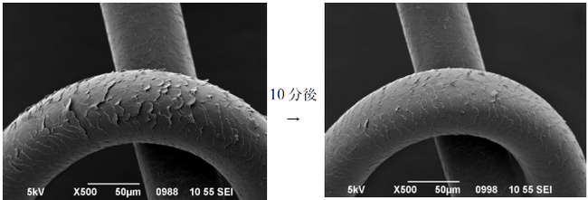 試験例)電子顕微鏡による⽑髪表面撮影サンプル⽑束を40度のお湯に漬け、DETOSPAの水素溶解装置を10分間稼働。