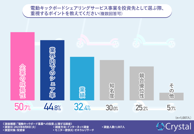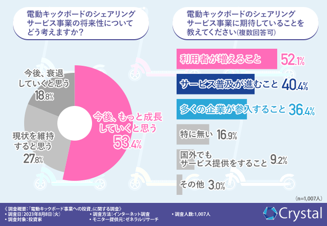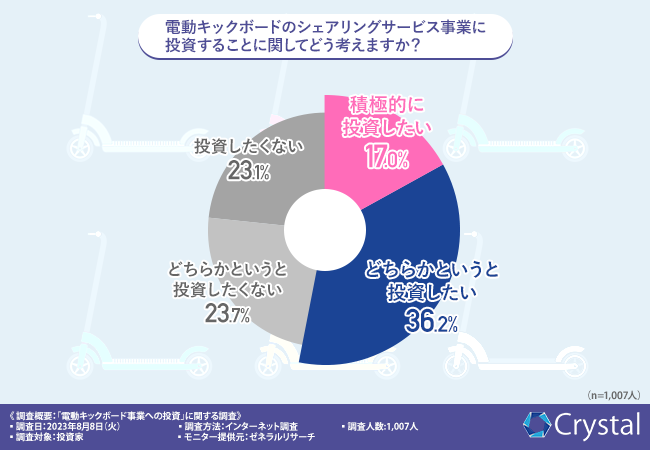 Crystal株式会社(所在地:愛知県名古屋市、代表取締役:蒼佐 ファビオ)は全国の投資家1,007名を対象に、「電動キックボード事業への投資」に関する調査を実施しました。