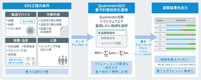こうしたなか、ロームとQuanmatic社は、2023年1月よりEDS工程におけるさまざまな制約条件を考慮した量子ソリューションを用いたオペレーションシステムの検討を開始。Quanmatic社が持つ、早稲田大学・慶應義塾大学の研究に基づく量子計算技術効率化のプロダクト群や、量子と古典計算技術を駆使した計算フレームワーク及び専門的な定式化技術に、これまでロームが蓄積してきた膨大な知見とノウハウ、各種データを融合させることで、2023年9月にプロトタイプの構築に成功しました。