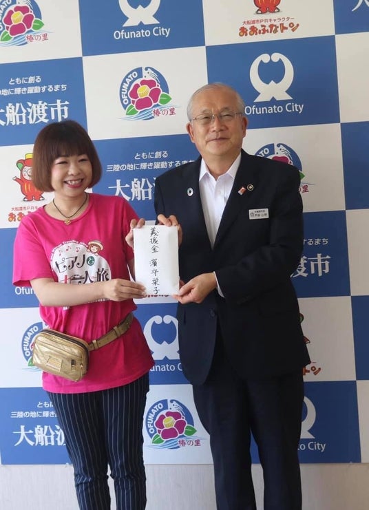 濱守栄子(左)と元大船渡市長(右)義援金寄付の様子。