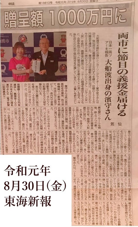 ・2019年、義援金1000万円を達成。大船渡市と陸前高田市の市長に推薦状をいただく。