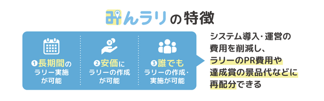 みんラリは、安価でラリーが作成できるため、現在開催中のラリーがある場合でも、同じアカウントで簡単に長期間のラリーを追加することができ、開催中のラリーに参加している方にも新たに開催するラリーに容易にアクセスできるようになるため、費用対効果が高いツールとなります。